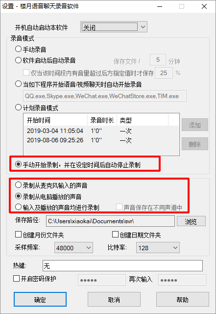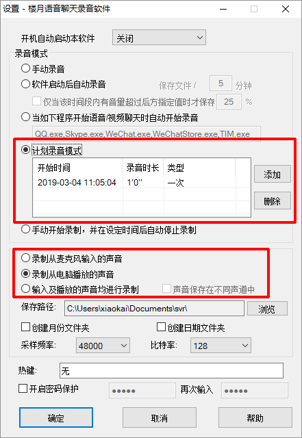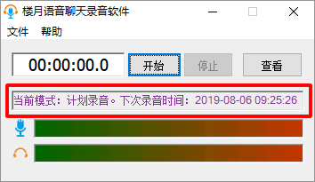 楼月语音聊天录音软件在最新版中增加了两大录音模式:“计划录音模式”,和“手动开始录制,并在设定时间后自动停止录制”模式。在计划录音模式下,我们可以提前添加录音的时间,当到达开始录音的时间点后,软件将自动开始录音,并在录制设定好的时间后自动停止录音。在“手动开始录制,并在设定时间后自动停止录制”模式下,在我们手动点击“开始”按钮开始录制后,软件将询问我们需要录制的时间,当录制了设定好的时间后,软件将自动停止录音。
