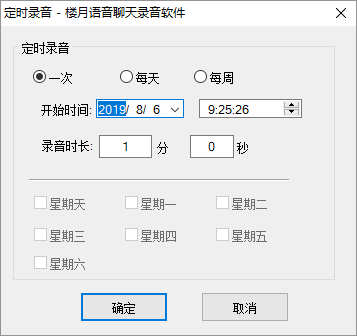 3,我们可添加“一次”计划录音,或“每天”的指定时间准时录音,或“每周”的哪几天准时录音。并在下方设置录音的时长。然后点击“确定”按钮返回主界面。